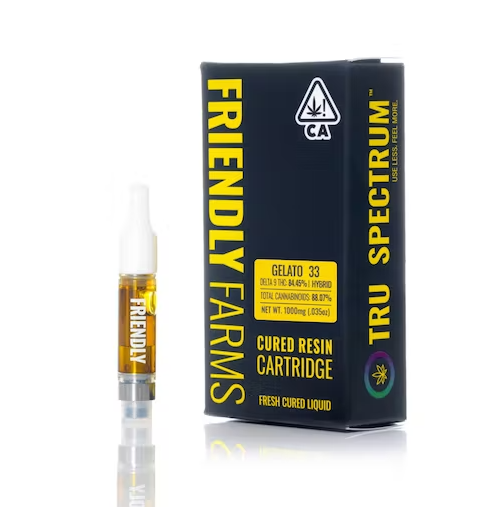 The FF (Friendly Farms) Gelato 33 Cured Resin Cartridge is a premium THC vape cartridge made with a full-spectrum cured resin extract, offering a rich, potent, and flavorful vaping experience. Extracted from the legendary Gelato 33 strain, this cartridge delivers a well-balanced hybrid high, making it ideal for relaxation, creativity, and mood enhancement.